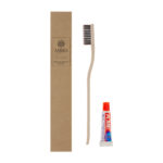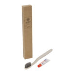 Eco-friendly dental kit combining functionality with care for nature. The kit includes a toothbrush made from material containing natural additives, reducing plastic usage and supporting more sustainable production. It also includes a 6g tube of A.ME toothpaste.