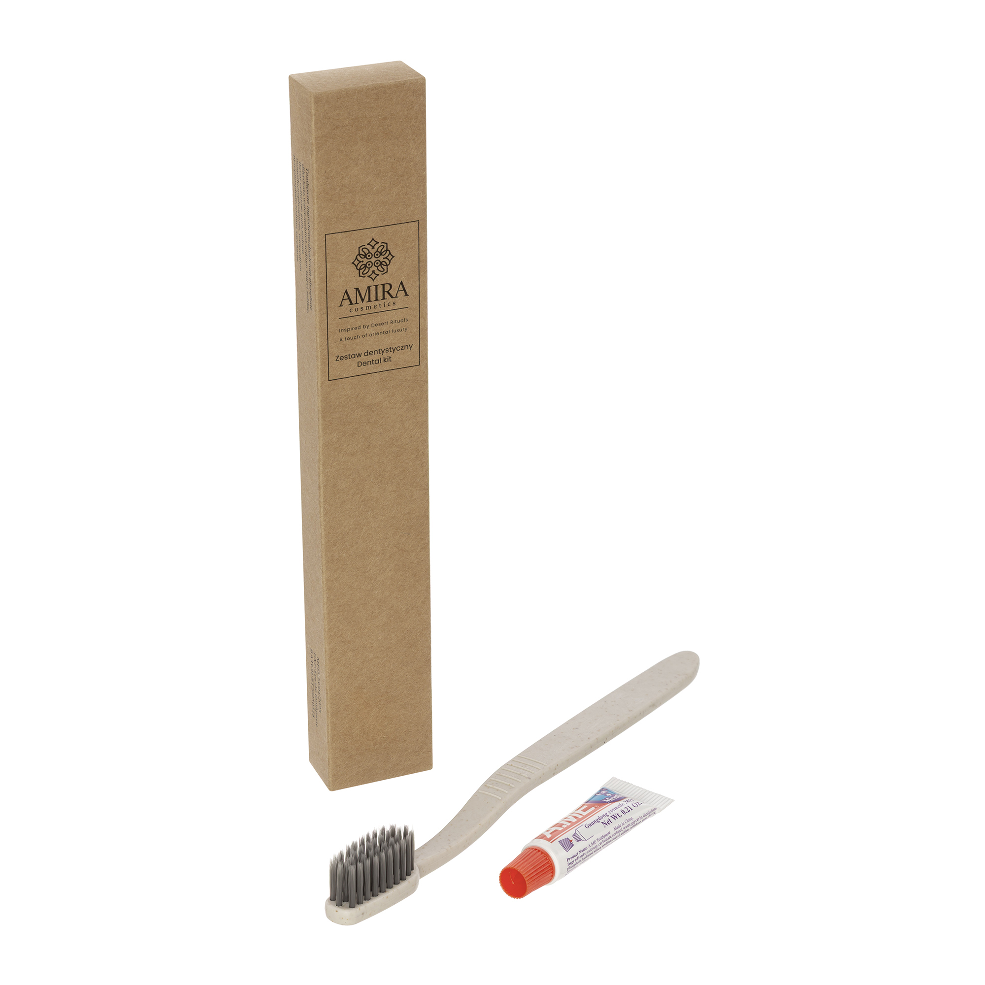 The Amira dental kit offers an oriental touch of luxury in an eco-friendly version. It is packaged in an eco-friendly box made from natural kraft paper, emphasizing its environmental friendliness. It belongs to the oriental Amira series, inspired by the traditions of Middle Eastern beauty rituals.