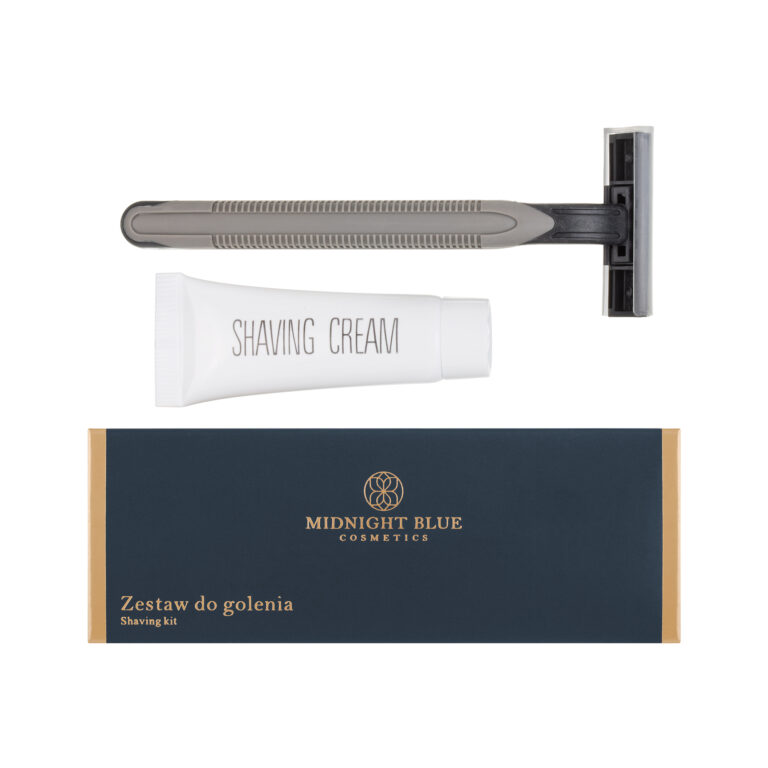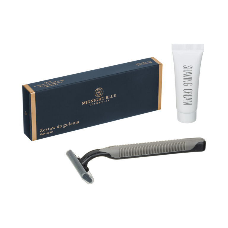 Immerse yourself in elegance and comfort during your morning routine with the hotel shaving kit featuring a razor and cream in an elegant navy box from the Midnight Blue collection. This essential bathroom amenity completes every high-standard hotel bathroom. The shaving kit includes a razor with two blades and a moisturizing strip for smooth and comfortable shaving, along with a tube of shaving cream that nourishes the skin, leaving it silky smooth and refreshed.