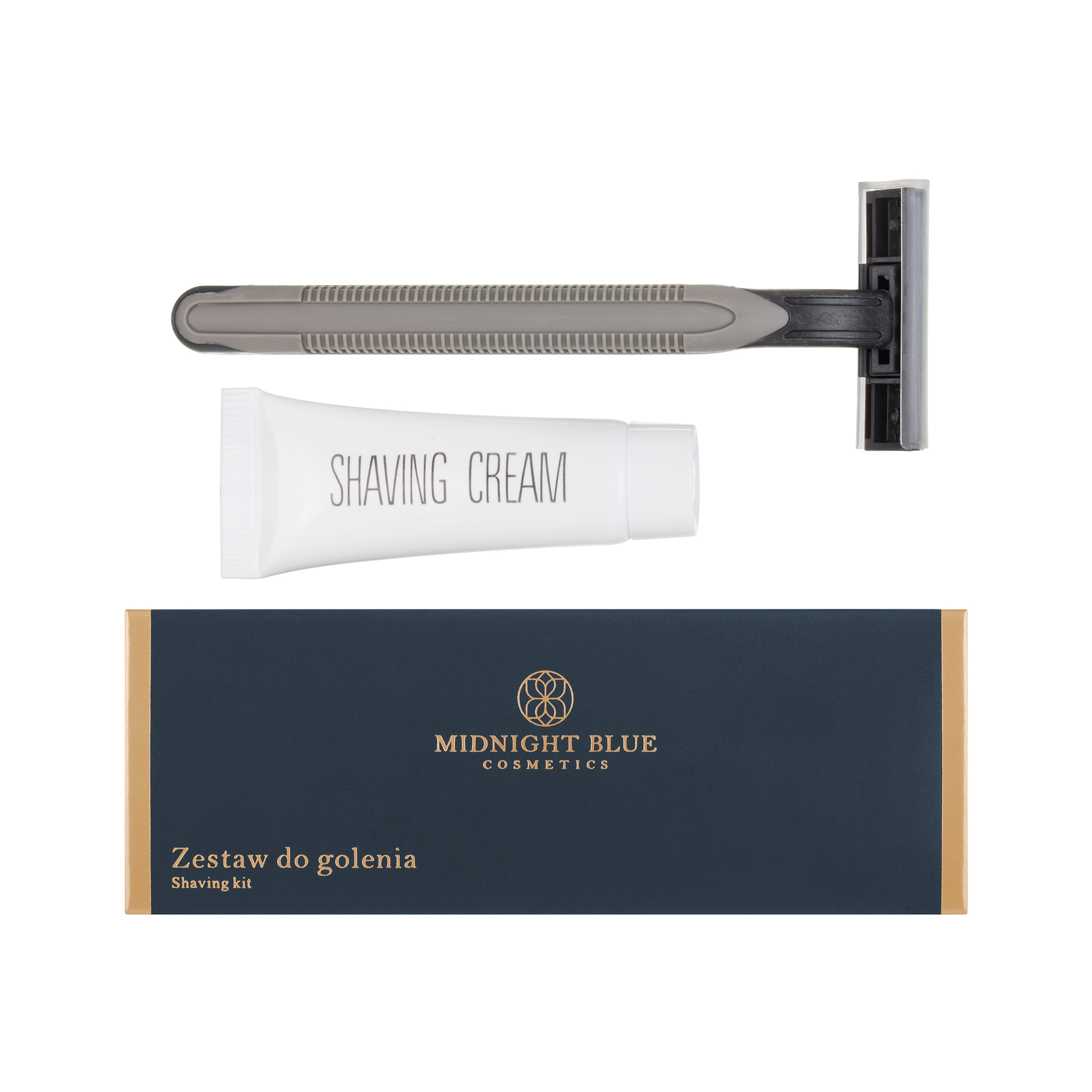 1,99 zł gross / 1 pcsHotel shaving kit with a razor and a tube of shaving cream in an elegant navy box.