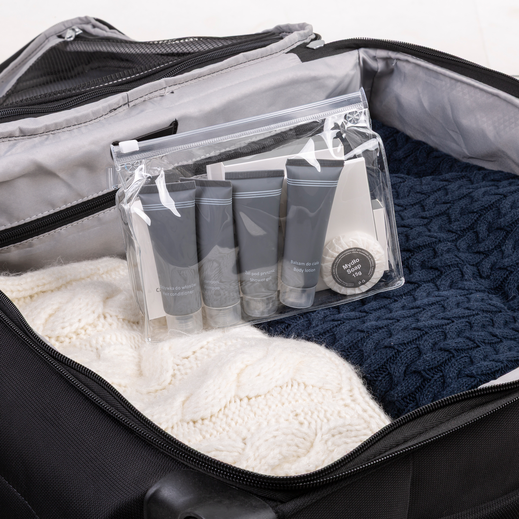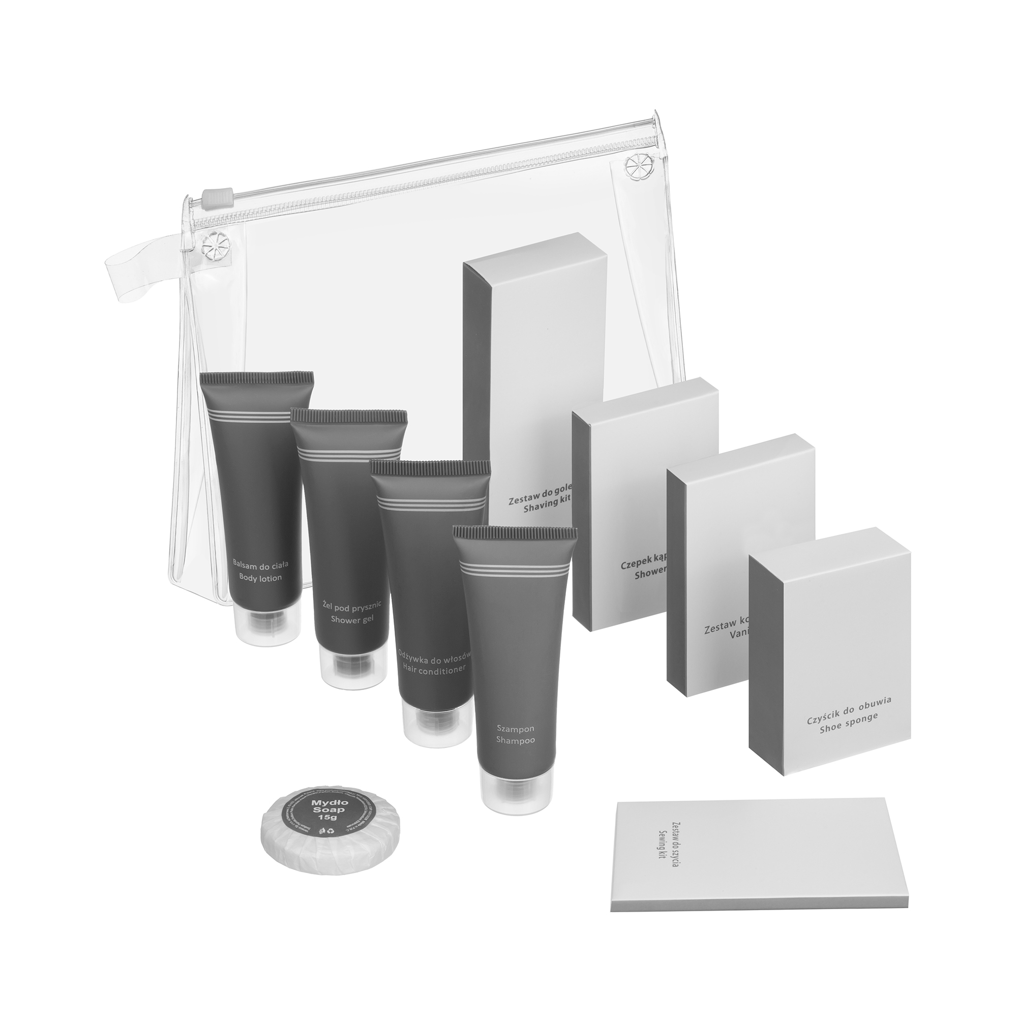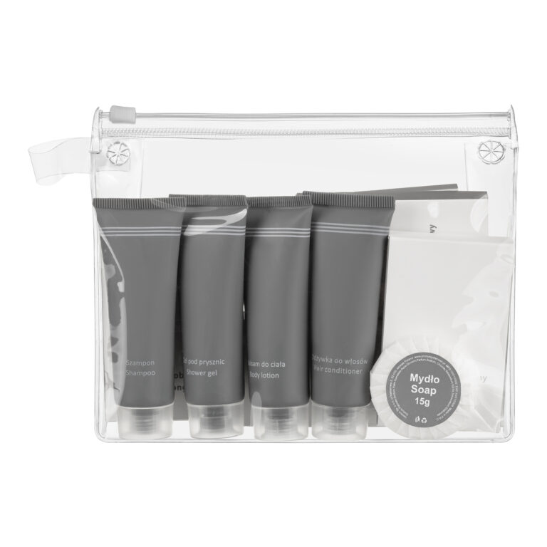 14,90 zł gross / 1 pcsA modern set of mini cosmetics and accessories enclosed in a transparent pouch. Perfect as a welcome package for hotel and wedding guests, and also a practical travel kit for any trip.