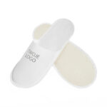 Flizelina zapewnia lekkość oraz komfort noszenia, a długość podeszwy (28 cm) pasuje do większości użytkowników. Kapcie wyróżniają się minimalistycznym wyglądem i podkreśla wysoki standard obiektu.